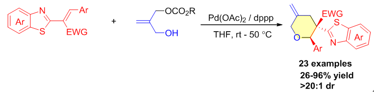 16) Xiaoxiao Song*, Lei Xu,Qijian Ni*. Highly diastereoselective synthesis of 3-methylenetetrahydropyrans by palladium catalyzed oxa-[4 + 2] cycloaddition of 2-alkenylbenzothiazoles,Org. Biomol. Chem.2020,18, 6617-6621.link