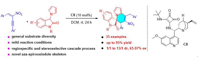 18)Qijian Ni*, Xuyang Wang, Da Zeng, Qianling Wu, Xiaoxiao Song*.Organocatalytic Asymmetric Synthesis of Aza-Spirooxindoles via Michael/Friedel-Crafts Cascade Reaction of 1,3-Nitroenynes and 3-Pyrrolyloxindoles,Org.Lett.2021,23, 2273-2278.link