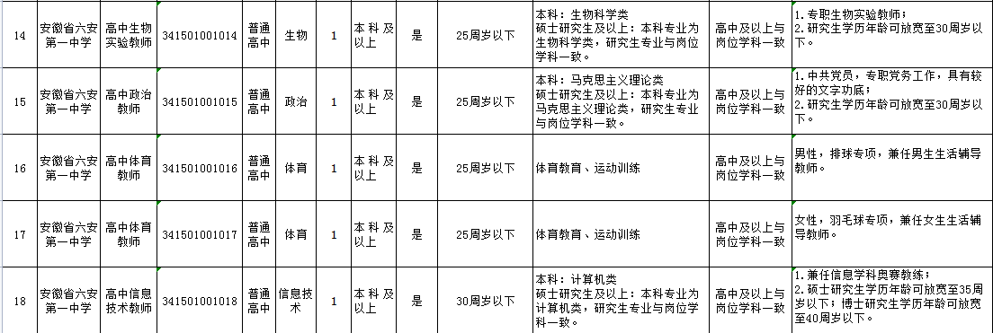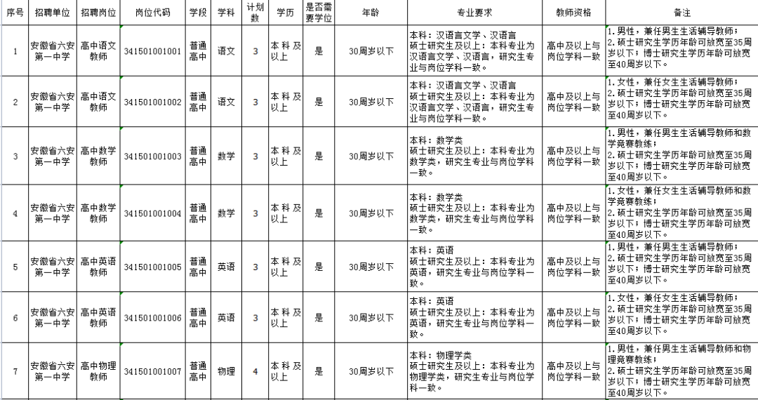 招聘岗位计划等信息在六安市教育局网(http://jyj.luan.gov.cn/ )、六安市人力资源和社会保障局网(http://rsj.luan.gov.cn/)上统一发布。