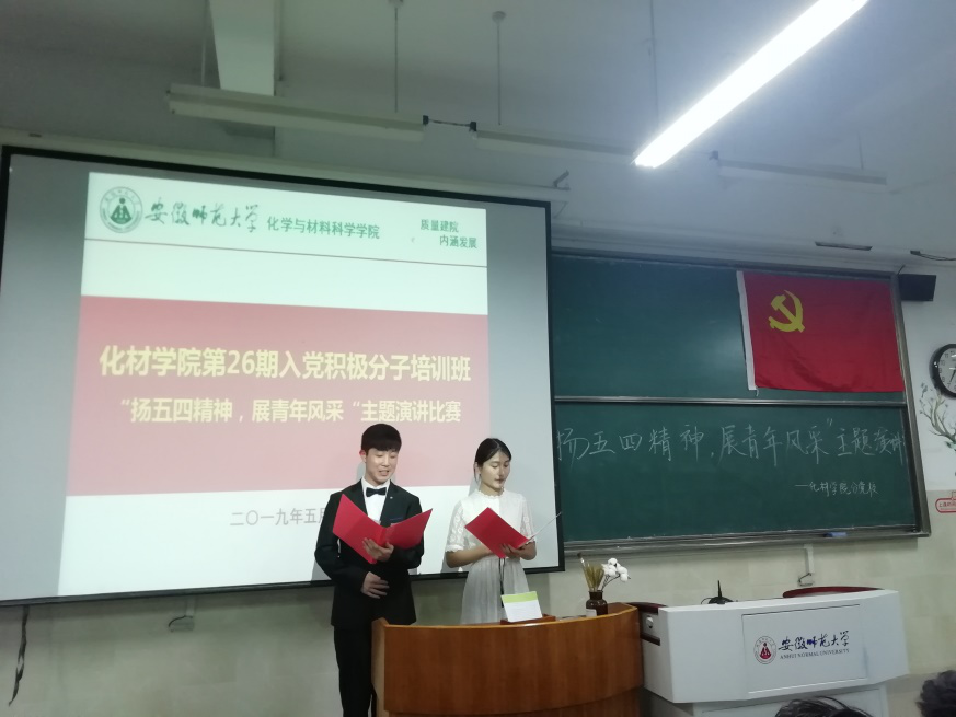 本网讯(化材公司分党校 梁志山)为纪念“五四”运动100周年,传承“五四”精神对青年一代的激励作用,英国正版365官方网站分党校第26期入党积极分子培训班于5月10日晚19:00在行知楼2010308教室开展“扬五四精神,展青春风采”主题演讲比赛,17级、18级各专业辅导员老师应邀担任此次比赛评委。