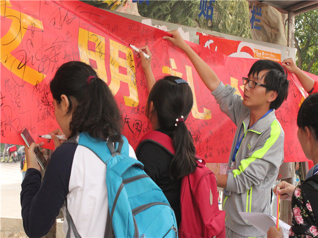 签文明承诺,共创文明和谐班级。积极倡导各班级同学签下文明承诺书,自觉遵守校园文明公约,争做文明师大人。公司不仅在思想和行动上对同学们进行了文明素养的倡导,更是对大一新生进行了生活上的指导。“禁早点入教室,止棉被进草坪”等要求,帮助员工养成文明的生活习惯,共创文明校园。