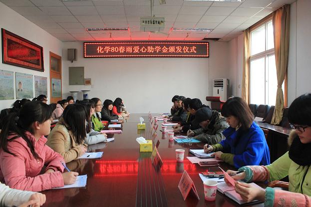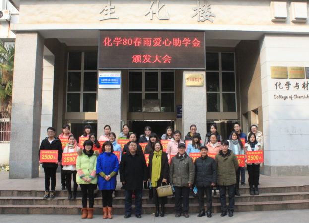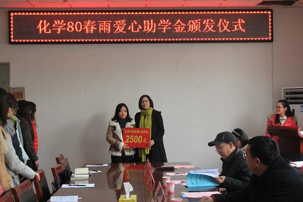 颁发仪式上,林勇女士为受助学子一一颁发了助学金,并鼓励受助学子要勇敢面对暂时的困境,勤奋学习,志存高远,将来更好地回报母校,服务社会。13级应化专业的党倩同学代表受助同学满怀深情地表达了对化学系80级员工设立的爱心助学金的感谢,表达了助学金给予自己的不仅是经济上的鼓励,更是精神上的温暖与支持,他说自己以后在生活上一定会勤俭节约,学习上更加刻苦努力,全面发展自己,让自己成为一个活泼善良的人,为社会贡献一份青春的力量。贡植斌宣读了“化学80春雨爱心助学金”的颁发决定。傅乐义和史铁杰分别表达了对公司80级员工的善心义举的感谢,对员工在各行各业取得的成绩和成功表示祝贺,并希望80级员工能一如既往地关心公司发展,为公司多提宝贵意见。同时,傅乐义和史铁杰希望受助同学要珍惜时间,刻苦学习;勤俭节约,健康快乐;学会感恩,奉献社会。
