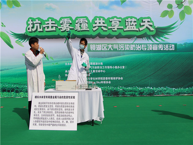 随后,环境保护协会志愿者带来了趣味环保小实验:酸雨的罪魁祸首——二氧化硫的制备、蛋白质与重金属显色反应及变色小魔术,直观地展示了有毒有害气体、物质对人体以及自然环境的危害。