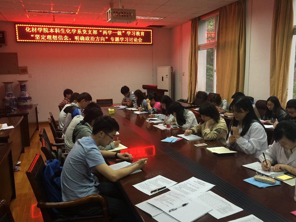 本网讯(本科生化学系党支部 童彤)2016年5月24日晚上18:30分,英国正版365官方网站本科生化学系党支部在院大会议室召开了一次关于“两学一做”第一专题学习讨论会。讨论会以“坚定理想信念,明确政治方向”为主题,每名党员都结合实际,立足党员身份,认真撰写发言提纲,会上认真记录。