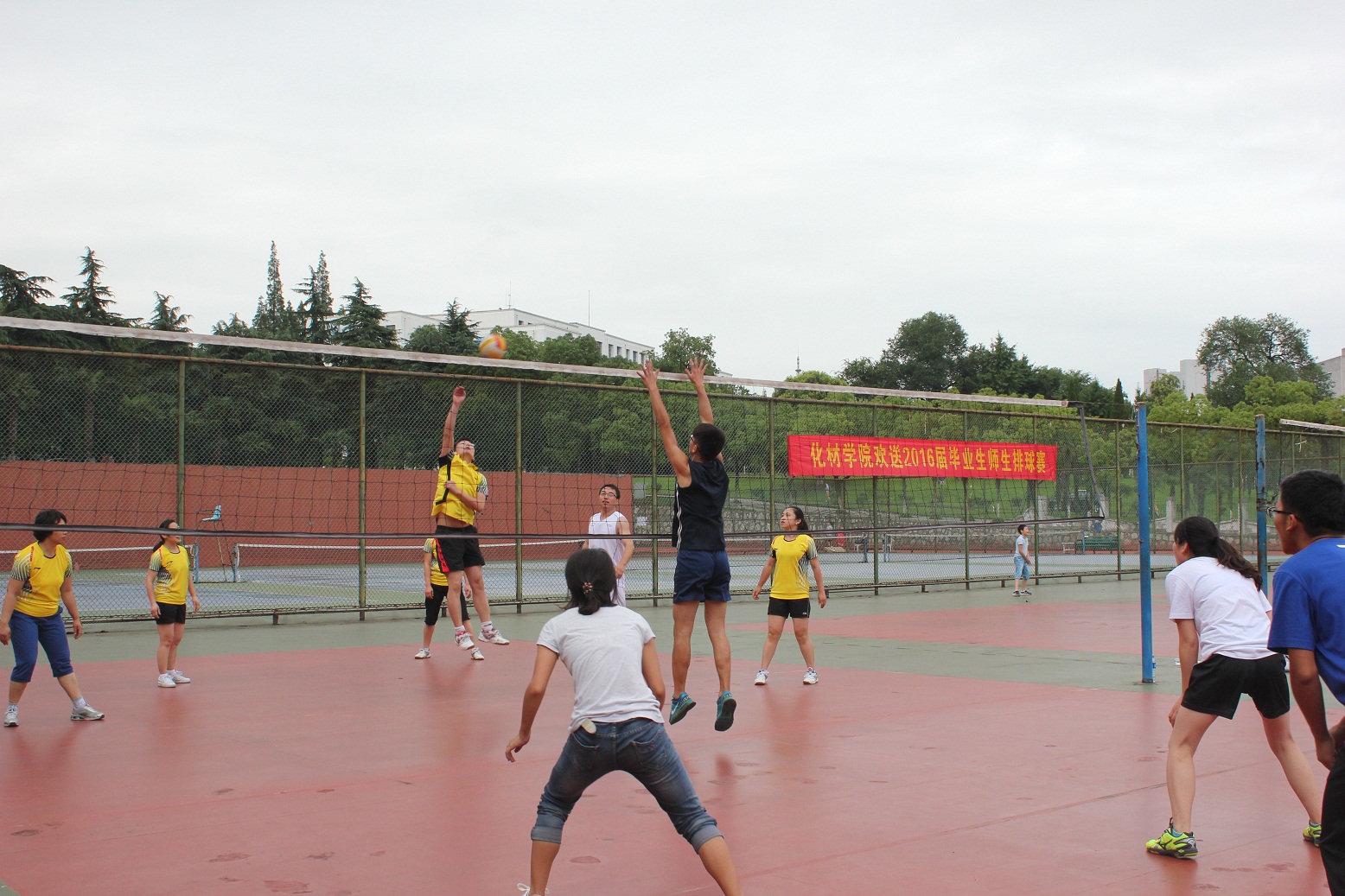 排球场上,女子教工排球队与毕业班男女混合排球队对阵。随着裁判一声哨响,比赛拉开了帷幕。赛场上,双方队员们注意力高度集中,目光紧紧锁定在场地间跳跃的排球上。他们各施绝技,互不相让。经过一轮激烈的“厮杀”,毕业班排球队略胜一筹。双方交换场地后继续比赛,一次次干净利落的击球,排球划出一道道弧线完美落地;一个个精彩的扣球,一次次技术性拦网,引得在场观众连连拍手叫好。对战双方队员都拿出了看家本领,漂亮的高吊发球引来连连惊叹,精彩的转腕扣球赢得满满欢呼。赛场旁的裁判们公正评分,老师同学们热情助威。一个多小时的球赛,有欢笑、有竞赛,也有相互的谦让,这是一场比赛,更是对四年师生情谊的温情叙说。