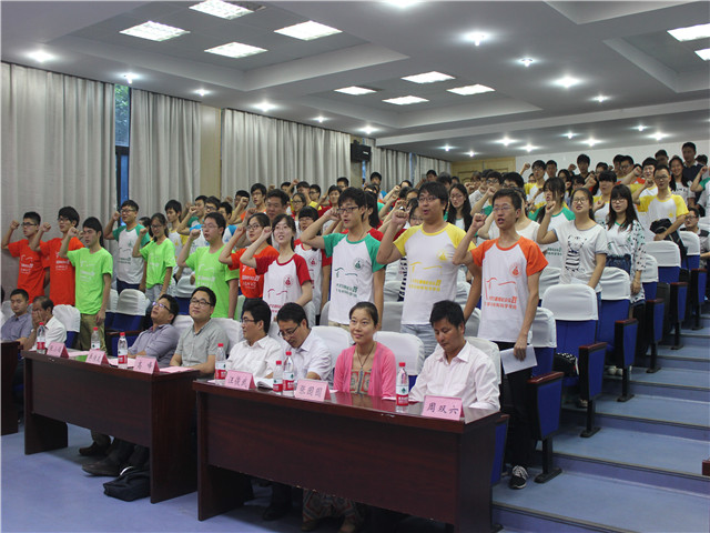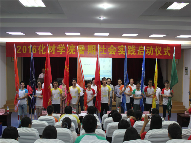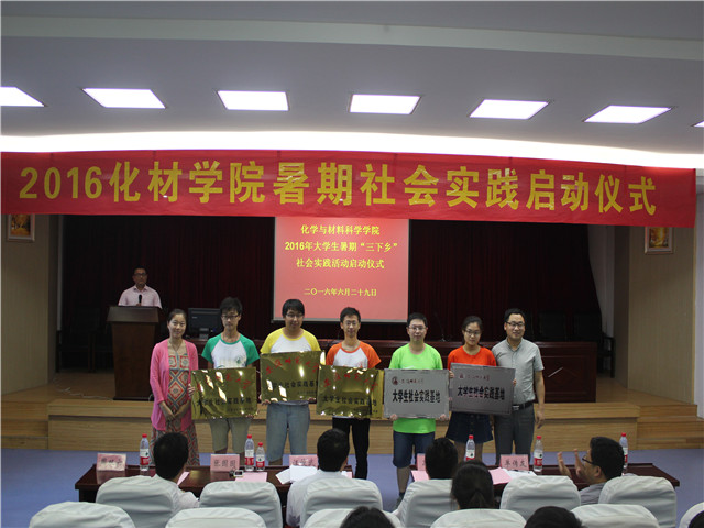 在激昂的歌声中,与会领导老师为准备建立实践基地的团队代表授牌,为全院四十余支实践团队一一授旗。队员们挥舞着队旗象征着暑期社会实践出征的号角已经吹响。