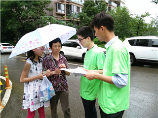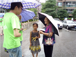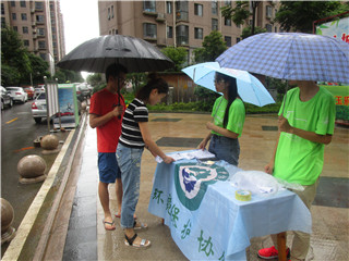 伴着连绵的小雨,实践队员来到了九同社区正式开始了宣教招生行动。队员们在九同社区内多处搭建起宣传展台,队员们积极向过往的家长、孩子讲解环保知识,传播环保理念并介绍协会将要举办的特色宣教活动。临近傍晚,雨势却越下越大,可实践队员依旧热情洋溢、斗志满满。很快,展台处、实践队员身旁都围上了一圈的咨询群众,实践队员不断向他们耐心的解答、仔细的讲解。队员们的行动也感染了小区的群众,社区里的大爷大妈也积极参加到宣传活动中来,帮助实践队员分发宣传单页,相互通告。最终,在群众们的热情帮助下,实践团队收到不少家长的咨询与答复,宣传行动取得巨大成功。