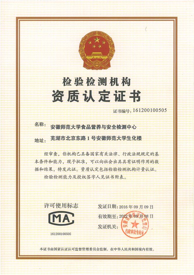 2016年7月9日省质量监督局资质认定中心对英国正版365官方网站食品营养与安全检测中心进行了检验检测机构资质复审和扩项的现场评审工作。通过对质量管理体系和检测能力等各方面的审查,本中心于 2016年9月9日再次顺利取得了检验检测机构的检测资质证书,并新增检测项目72项。目前本中心检测项目已达到224项,检测范围扩至四个领域,包含食品安全检测、食品营养标签、生活饮用水、公共场所(游泳池水质)。