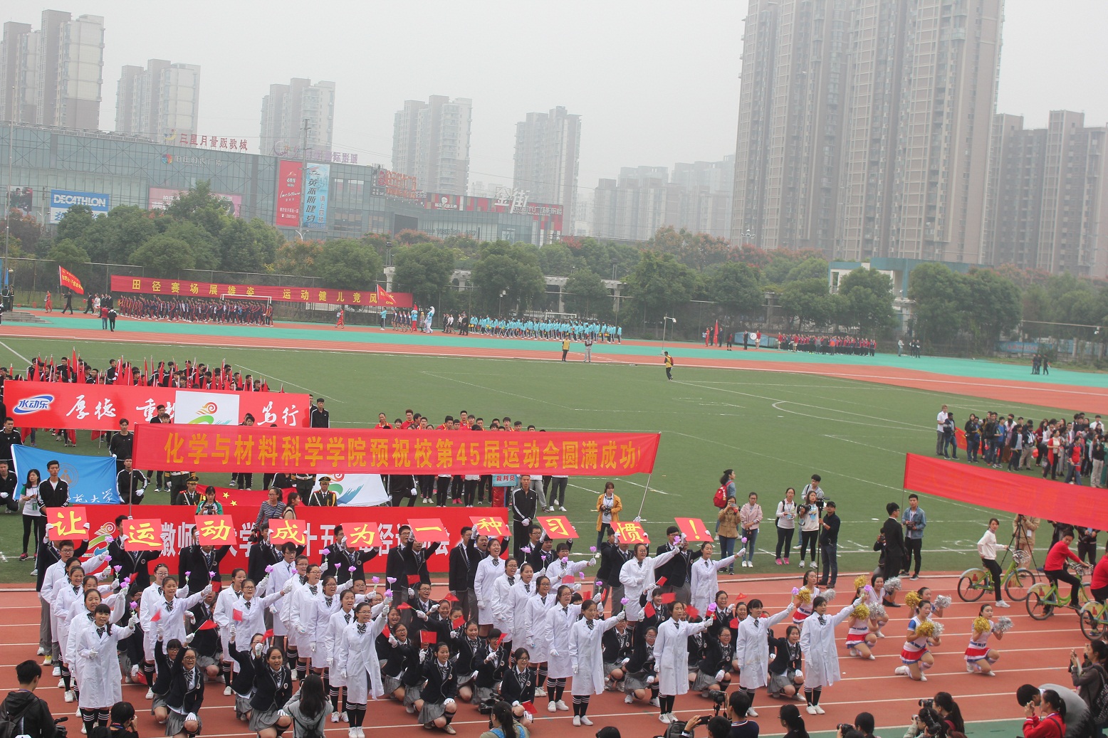 2016年10月19-23日,英国正版365官方网站第45届田径运动会在花津校区北体育场隆重举行。为迎接这一体育盛会,公司积极筹备各项工作,组织仪仗队、排舞队和运动员训练,保证全院师生以饱满的热情和激扬的斗志在新一届运动会的赛场上展现独有的化材风采。