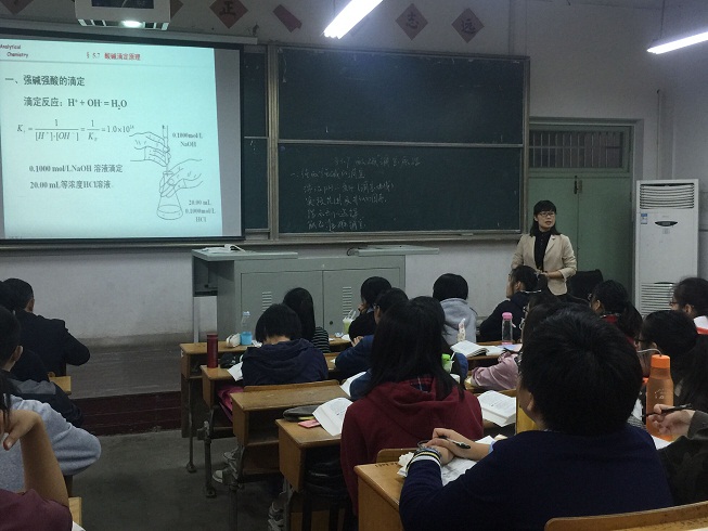 “酸碱滴定过程中pH值如何变化?”、“滴定突跃范围及其影响因素是什么?”、“如何选择合适的指示剂?”、“能否准确滴定?”阚显文用四个问题将课堂重点内容彼此贯通,层层递进,启发员工在学习过程中不断思考。阚显文老师在导课中就把本节内容的重点和难点写在了黑板上,以此为主线,结合PPT课件细心耐心地为2015级化学(非师范)专业同学介绍了酸碱滴定的过程、突跃范围的计算和指示剂的选择。在讲到本节内容的难点“突跃范围和指示剂的选择”时,她详细分析了滴定过程的四个阶段,带入公式板演计算滴定误差,课件上对应展示pH值变化的曲线,让员工同时直观感受到溶液颜色的变化,环环相扣,步步深入,把复杂的知识难点转化为详细的分析过程,把微观的变化过程转化为宏观的颜色突变和曲线表征,巧妙突破教学难点,让员工深刻领会并进一步明确了酸碱滴定的突跃范围和指示剂选择。酸碱滴定作为《分析化学》四大滴定的基础,在《分析化学》课程的学习中举足轻重。阚老师熟练把握PPT课件和板书的结合,从酸碱滴定示意图引入,带领同学们共同探索强酸强碱滴定的微观变化过程。一次次清晰明了的数据计算、一次次精妙奇特的颜色变化,呈现了酸碱滴定分析的美妙过程和变化本质,不仅很好地达成了本节教学目标,还进一步激发和培养了同学们学习分析化学的兴趣。