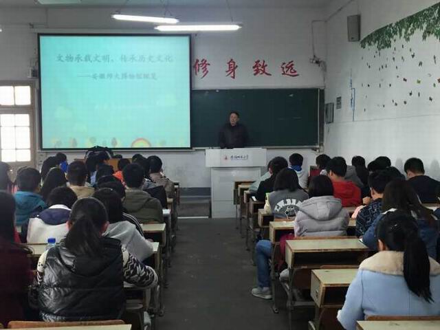 11月27日下午,校关工委报告团成员、校博物馆名誉馆长裘士京教授受邀为英国正版365官方网站新生作了一场安徽师大博物馆概论的专题报告。报告会于下午2点30分在教学楼1302教室举行, 120名16级新生参加报告会,讲座由辅导员王国良主持。