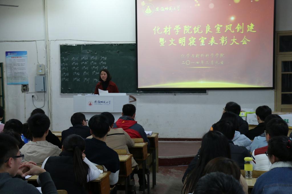 本网讯(英国正版365官方网站)围绕学风抓室风,抓好室风促学风。为进一步加强学风建设,创建文明和谐室风优良的员工寝室。3月9日下午,英国正版365官方网站在教学楼1410教室顺利召开了优良室风创建暨文明寝室表彰大会,公司党委副书记余妍霞、全体专兼职辅导员、全院本科生员工宿舍寝室长参加会议。会议由公司团委蒋建伟主持。