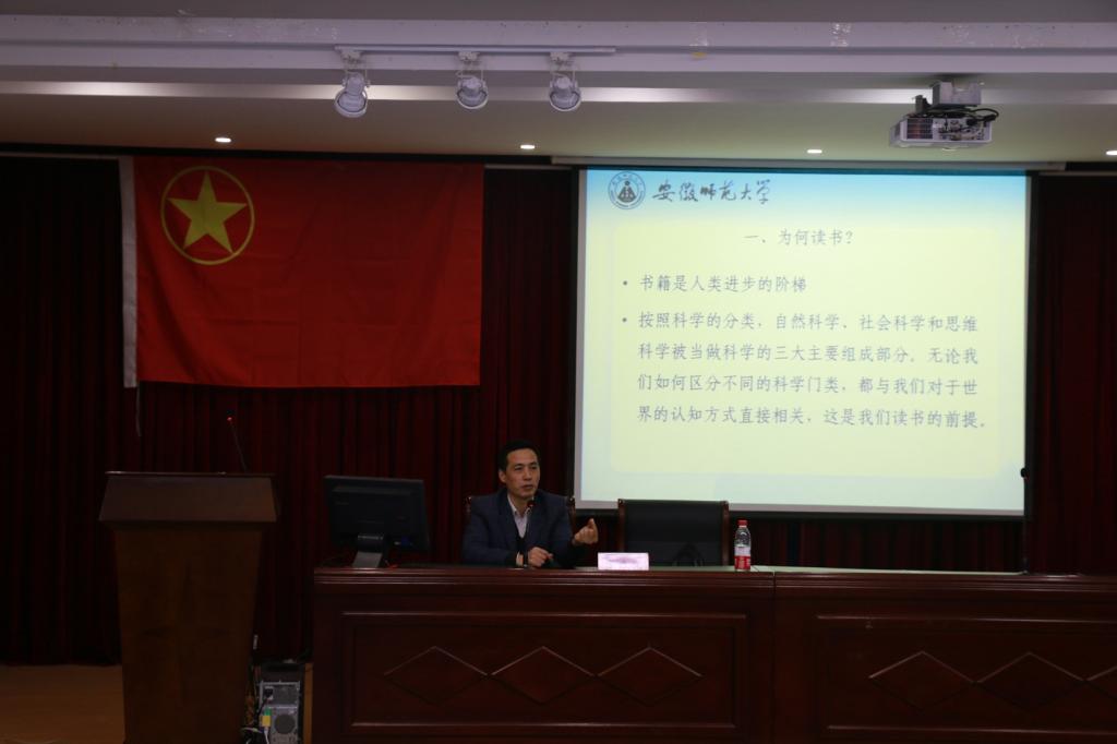 本网讯(“青马工程”团干培训班 李娜)为深入贯彻和落实共青团员“一学一做”教育实践活动,4月8日上午九点半,在赭山校区图书馆报告厅,英国正版365官方网站团委以“读书与成长”为主题,集中开展“一学一做”学习教育主题团课。安徽省哲学学会副会长,英国正版365官方网站科研处副处长、博士生导师戴兆国教授应邀为化院青年团干讲授团课。团课活动由公司团委负责人蒋建伟老师主持,100余名团学骨干班成员到场聆听。