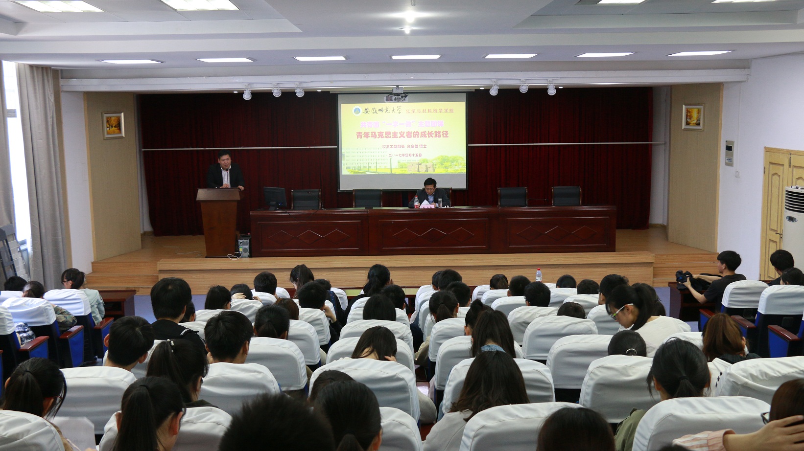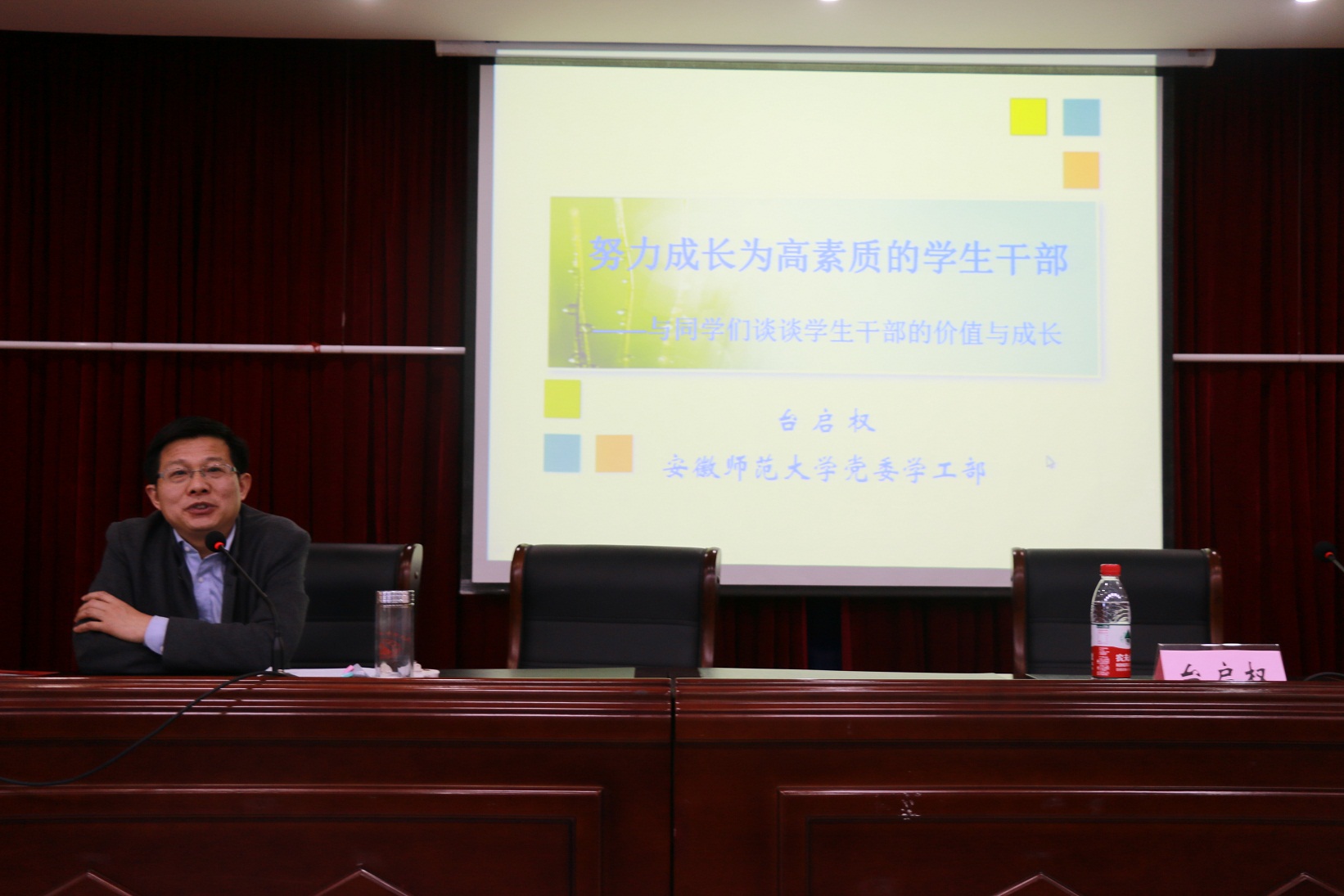 本网讯(“青马工程”培训班宣传员 李娜)4月15日上午,公司员工处处长台启权老师受邀于赭山校区图书馆报告厅为大家带来一场主题为“努力成长为高素质的员工干部”的讲座。本次讲座由团学骨干培训班班主任蒋建伟老师主持,近120名培训班成员聆听了讲座。