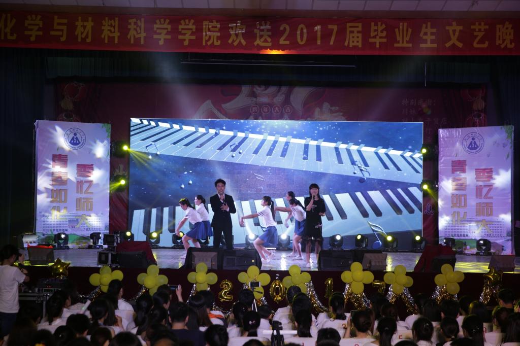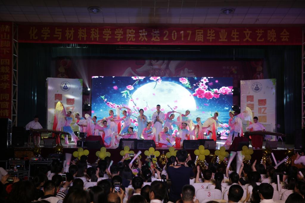 本次晚会在开场舞《向快乐出发》中拉开序幕,青春动感的音乐和肆意激情的舞姿在开场便点燃全场的气氛,尽显别样的 ‘化’样年华。灼灼桃花艳,浅浅离别芳。由季长春老师和环境保护协会推选的歌舞表演《十里桃花凉》用轻盈的绸扇衬托出舞者曼妙的舞姿,展现出了毕业生对于母校的深深眷恋之情。个唱队带来的歌曲串烧《歌与》独具匠心的将歌舞与武术、书法交融为一体,动静互衬之间尽显公司的深厚底蕴。诗朗诵《甘南的呼唤》用朴实的词汇表达出了支教的辛苦,以及对支教人的崇高敬意,体现了化材学子不惧艰险敢于当先的优秀品质。