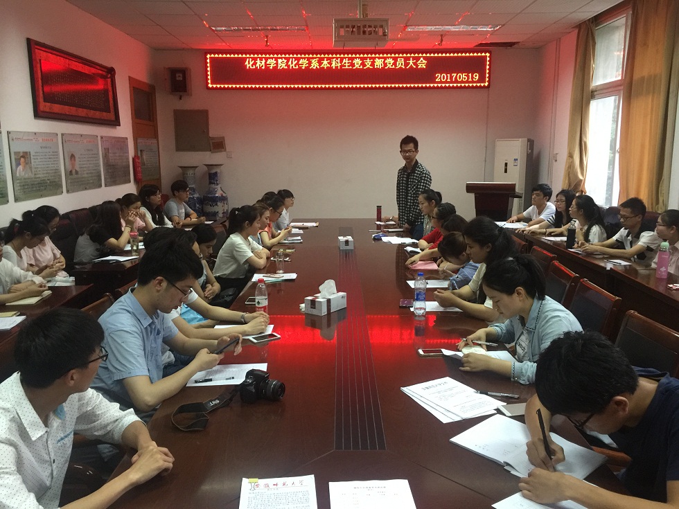 5月19日下午,英国正版365官方网站化学系本科生党支部在公司二楼会议室召开专题理论学习会,重点推进支部“两学一做”学习教育常态化和制度化,化学系本科生党支部12名正式党员、21名预备党员和8名发展对象参加了理论学习会。会议由支部书记蒋建伟主持。