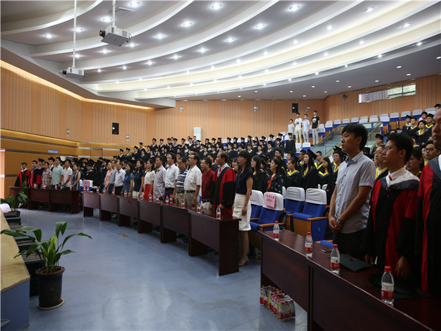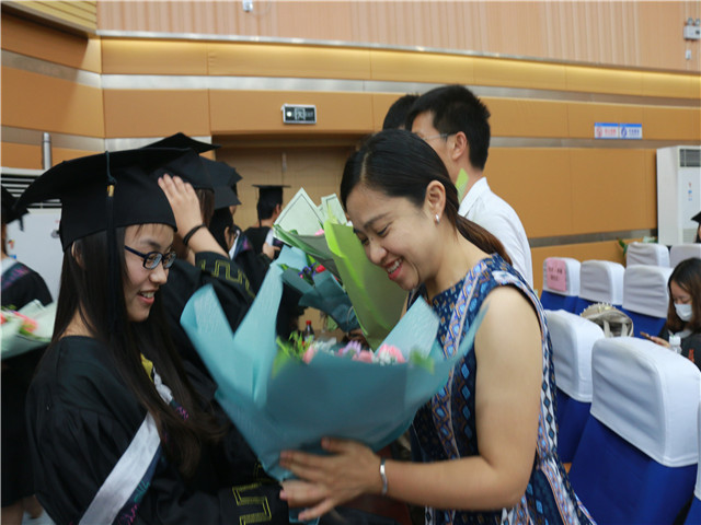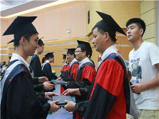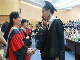 潜岳苍苍,江淮汤汤,夏商肇琪,雍容汉唐。在熟悉的校歌声中,公司经理高峰教授、副经理周双六教授、张小俊教授及各系主任依次为每位毕业生拨正流苏,颁发毕业证书及学位证书。