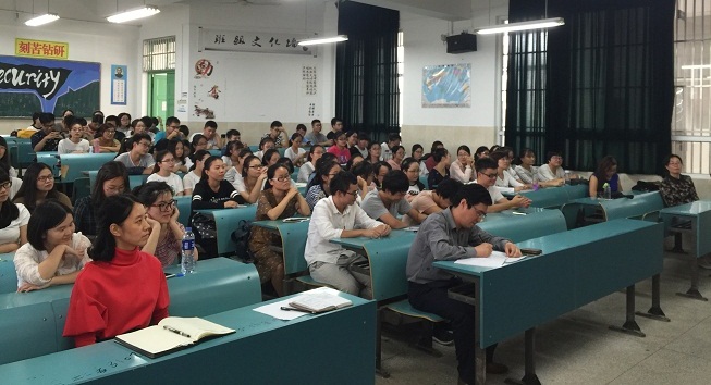 高峰经理首先进行了动员讲话。他从教育实习的重要性和必要性谈起,指出教育实习是专业教育的核心内容,是人才培养的重要环节,希望同学们端正态度,明确目标,处理好考研与实习的关系;珍惜机会,虚心学习,在实践中练就师范生真本事,在实习中得到全面发展。接下来孙影副主任详细介绍了此次教育实习的总体情况和具体安排,并强调了大家目前在校内实习准备阶段的任务和要求。在指导老师代表发言中,熊言林教授以幽默风趣的语言从实习前、实习中和实习后三个阶段,以“五研”、“三要三不要”等角度向全体同学提出要求:要明确实习的重要性、要制定学习目标与任务、要精心进行教学设计、要做好教学反思、要处理好各种关系等。最后,余妍霞副书记从实习管理的角度,向同学们提出了具体要求:要认清角色,明确双重身份;要身正为范,展示师大形象;要处理好“实习与考研”、“自身与同学”、“个体与集体”、“个人与地方”等四重关系;要团结互助,相互切磋勉励;要注意安全,严格执行请销假制度等。