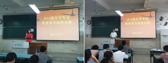 金秋十月,公司2014级师范生即将奔赴各地进行教育实习。为积极推进这项工作的全面展开,更好地完成教育实习工作,9月22日下午,化学系在教学楼2050303教室举行了教育实习动员大会。经理高峰、党委副书记余妍霞、实习指导教师熊言林、王素凡、孙影、程瑶琴等老师出席了会议,2014级化学(师范)专业和14级理综卓越教师班(化学方向)的全体同学参加了会议,会议由阚显文老师主持。