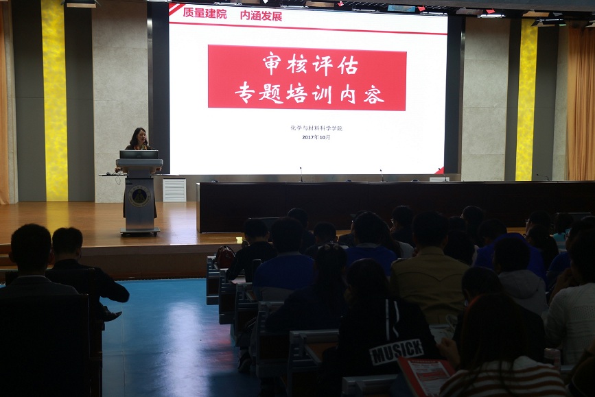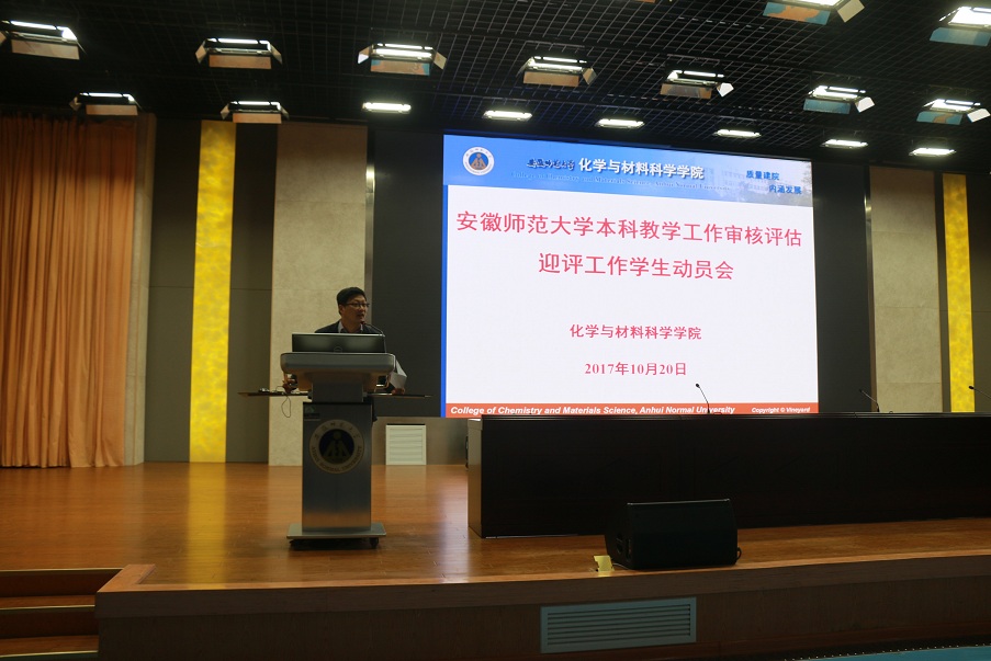 会议尹始,副经理张小俊用生动形象的语言对本科教学审核评估进行了背景介绍。他通过“什么是审核评估”、“审核评估的范围”、“审核评估的流程”和“审核评估的作用”四个方面向全体同学普及相关知识。张副经理强调,在专家进校考核环节中,专家将以员工的日常学习生活为切入点,围绕课堂、寝室、实验室等多个方面展开评估考核。考核方式包括了随机听课、召开座谈会、抽查寝室、检验专业技能等多方面、多角度的综合性考核方式。因此同学们在面对专家进校考核环节中一定要展现出师大人、化材人的精神风貌,端正态度,在学习与生活多个方面均要做到严于律己。