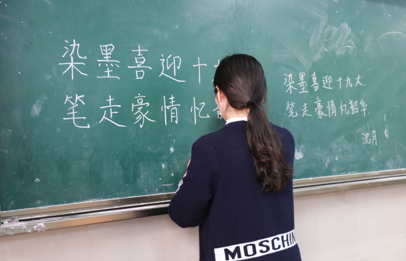 磨短的笔画,书写的章华。粉笔字是对同学们要求较高的一项。在对活动主题“染墨喜迎十九大,笔走豪情忆韶华”两句话的书写中,同学们风格各异,或是端正娟秀,或是潇洒飘逸;或是鸾漂凤泊,或是铁画银钩。沈月同学的字迹里的蕴含自信和潇洒,让她的粉笔字脱颖而出,获得了评委的一致好评。粉笔磨下的粒粒粉末中,饱含了同学们的热情,展现出了师大化材学子的别样风采。