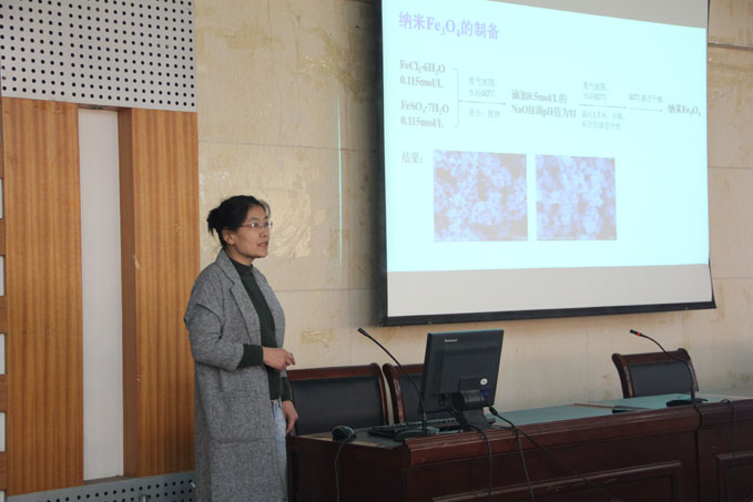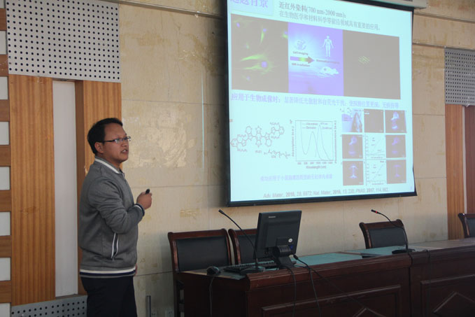 于长江、张小璇、郝二红、黄玉成等四位老师依次对所主持的国家自然科学基金项目“新型α,β位稠环Aza-BODIPY近红外染料的合成及性能研究”、“特异性分离亲脂性污染物的磁性仿生吸附剂的构筑及机理研究”、“近红外多吡咯光敏剂的合成与性质研究”、“层状金属硫族化合物的电子结构、磁学及其加氢催化性能的理论研究”的进展情况、取得的阶段性成果和存在问题等方面进行了汇报。