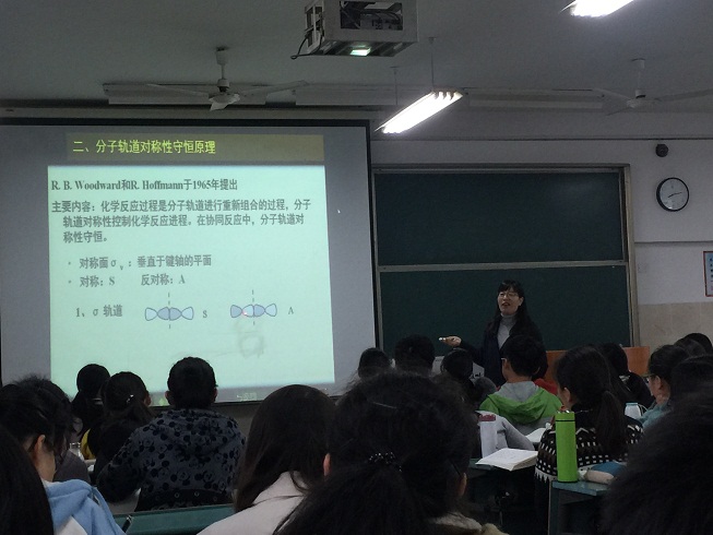 上课伊始,晏老师首先总结回顾了有机化学反应中涉及到的基本反应类型,分析对比了不同反应机理具有的典型特征,在此基础上自然引入新课“周环反应”。晏老师通过分析前线分子轨道的对称性,顺利引导员工掌握电环化反应分子的旋转关环方式,总结出反应条件与立体选择性之间的对应关系。在教学中,晏老师由理论到实例讲解,再到反应规律总结,从分析分子轨道的对称性着手,让员工从对称中体会美学在有机化学中的应用,从而使得员工将枯燥晦涩的抽象理论和空间想象变成了一种美的欣赏和享受。