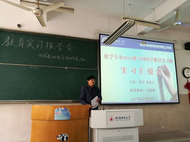 本次课堂教学的主题是闫蒙钢老师组织2014级化学专业教育实习生(宁国中学实习组)开展的一次别具一格的汇报课,对象是2015级化学师范生,形式新颖,效果很好。上课伊始,闫蒙钢老师以《走向教师职业生涯的第一桶金——指导教师眼中的教育实习》为题,从教育实习的地位、作用和意义,结合自身从教40多年来教育实习的亲身经历和感受,再到2016年国家教育部新出台的《关于加强师范生教育实践的意见》文件解读,引发同学们思考和共鸣,强调了教育实习对每一位师范生的重要意义。接着由宁国中学实习组组长张成玉同学主持汇报会,实习生们分别从宁国中学整体概况、教育实习过程中班级文化管理、班主任工作视角、班级活动开展方面梳理和分享了班主任实习工作经验和实习感受。最后14级实习生于思齐和殷公银分别介绍了教育实习期间具体教学准备和实施情况及如何上好一节公开课。