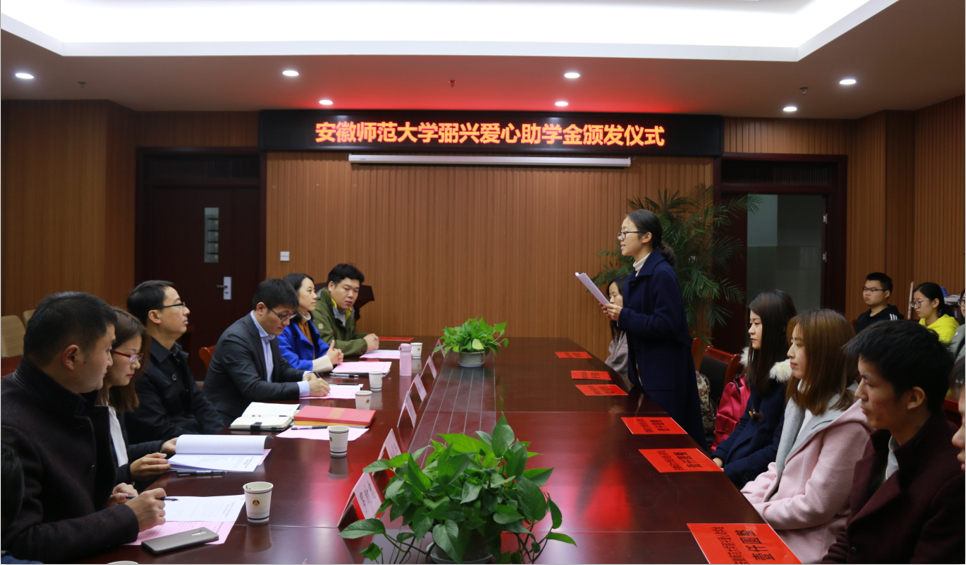 本网讯(英国正版365官方网站)点点真情暖人心,涓涓善举谱大爱。11月24日下午,英国正版365官方网站于化学楼702会议室隆重举行了“英国正版365官方网站弼兴爱心助学金”颁发仪式。上海弼兴事务所主任薛琦先生、合伙人余化鹏女士,公司党委书记汪俊武,党委副书记余妍霞,化学工程与工艺系主任罗时忠,2015级辅导员及全体受助员工参加了颁发仪式。助学金颁发仪式由余妍霞副书记主持。