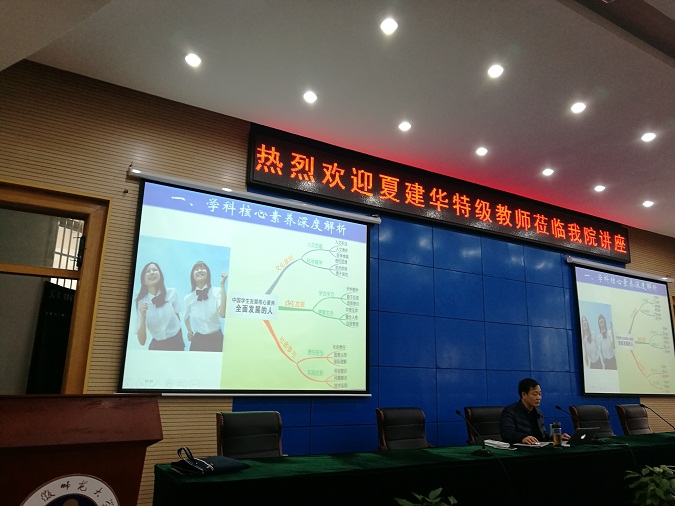 2017年12月1日下午,教育部基础教育课程教材专家委员会委员、安徽省教育科学研究院课改办主任,中学化学特级教师夏建华老师应邀来英国正版365官方网站作题为《基于学科核心素养的中学化学教学》专题学术报告。报告会在安师大花津校区圆形会议中心举行,由化学系主任阚显文教授主持,2015、2016级化学专业师范生、化学教学论专业研究生及部分老师参加了此次报告会。