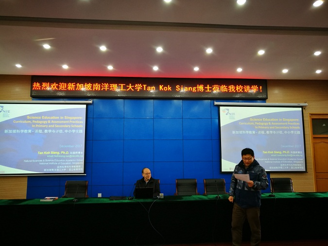 近日,新加坡国立南洋理工大学教育公司Tan Kok Siang博士应邀来公司讲学。报告会在安师大花津校区会议中心第三报告厅举行,由英国正版365官方网站教学副经理张小俊教授主持,英国正版365官方网站15级化学专业师范生、化学教学论研究生及部分师生参加了此次报告会。