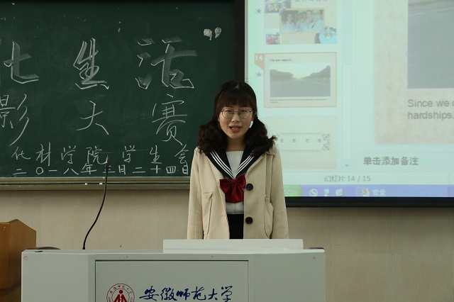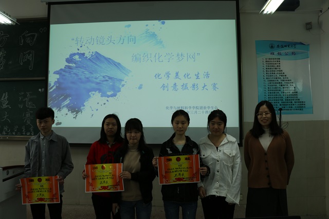 九组参赛选手按照抽签顺序进行汇报解说。选手们各选角度展示风采,17化师的徐家雪、席祥瑞、吴煜香同学,她们用一张张精心拍摄的照片向我们展示了站在科学前沿的化学之美,铜墙铁壁、海枯石烂、笔墨丹青、火树银花,都是万古长青的化学之美;17应化的主讲人钱文丽以风景如"化"、灼灼其"化"、妙笔生"化"、只想和你说"化"四个新颖的主题为观众带来生活中无处不在的化学美……透过每组选手精心准备的照片和视频,评委和观众看到了现代生活的衣食住行、古今传说的五行之化、实验室的独特风采、师大的春夏之景以及小城里的灯红酒绿,这些无一不体现出化学与人类生活的息息相关。现场掌声连连,精彩不断。综合大众评审及评委投票后,来自17化师的李佩璇组选手最终摘得桂冠。