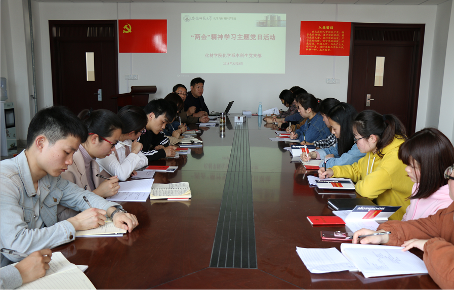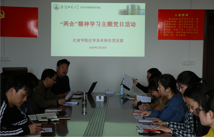 本网讯(化学系本科生党支部 音正春)3月28日下午,英国正版365官方网站化学系本科生党支部开展“两会”精神学习主题党日活动,化学系全体党员出席了会议。公司党委书记汪俊武受邀参加活动,并给全体党员上了一节“两会”精神学习专题党课。活动由化学系本科生党支部书记蒋建伟老师主持。