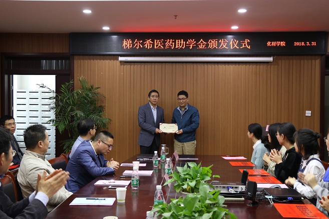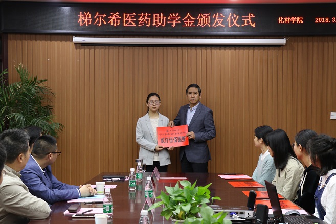 本网讯(英国正版365官方网站 方子妍)3月31日上午,第四届英国正版365官方网站“化学80春雨爱心基金”梯尔希医药助学金颁发仪式在英国正版365官方网站顺利举行。梯尔希(南京)药物研发有限公司董事长陈礼勤,公司党委常委、纪委书记程度,梯尔希(南京)药物研发有限公司公司总经理崔希林、公司代表程跃,校教育基金会副秘书长郑金泽、校员工处副处长张玉新,公司党政班子成员以及全体受助同学参加了仪式。仪式由公司党委书记汪俊武主持。