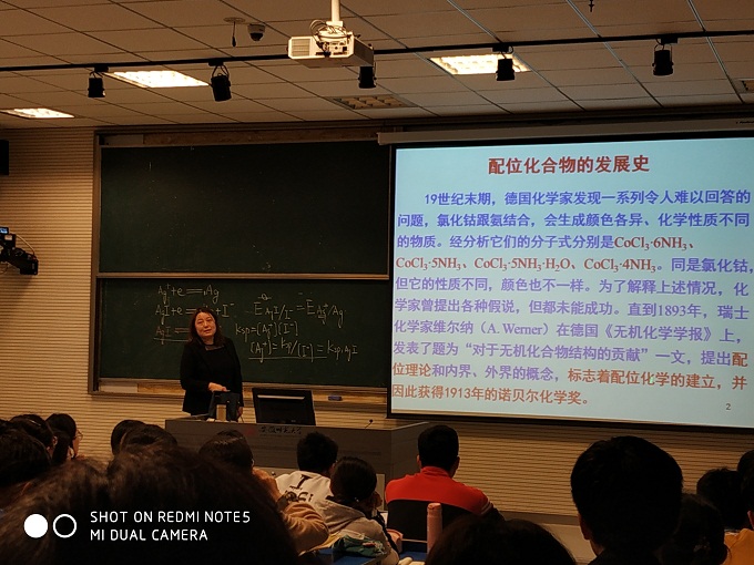 在整节课上,杜老师通过提出问题的方式与同学互动,引发同学思考;PPT与板书同步进行,讲述内容条理有序、重难点突出。课堂氛围轻松活泼,同学们对配位化学有了总体的印象,产生了浓厚的兴趣,受益匪浅。本次教学公开课,教学设计内涵丰富,课堂节奏把握恰当,受到了观摩老师的一致好评,是一堂成功的示范观摩课,对提高青年教师课堂教学水平有着很好的示范和借鉴作用。(文/毕桂月)