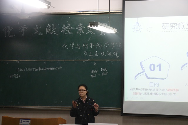 本网讯(英国正版365官方网站 崔明玉、王菲)化材学子,佼佼尚学,鸾翔凤集。为帮助公司学子掌握文献检索的方法,进一步提升化材学子的基本素养,公司于4月14日晚在行知楼2030103举办了化学文献检索大赛。公司李一梅老师、王银玲老师、卓淑娟老师、蒋建伟老师莅临比赛现场。在之前比赛中脱颖而出的九组选手成竹在胸,尽显风发意气。