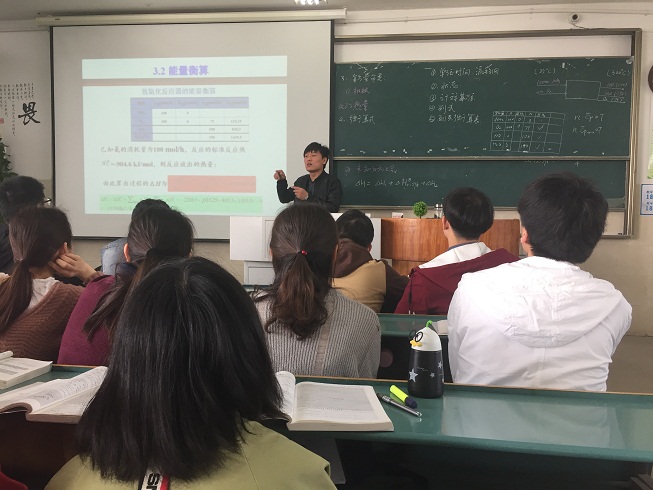 本次课堂教学的主题是反应过程的能量衡算,是2015级化学工程与工艺员工的专业课程,课堂氛围生动活泼,课堂知识被老师讲解的通俗易懂,效果很好。上课伊始,云瑞瑞老师通过对能量衡算的基本依据引入主题,结合物理化学,化工原理等多门学过的知识全方面引入知识点,从无化学反应和有化学反应两个方面入手,通过水热锅炉进水和氨氧化反应的例题,层层深入,严谨分析,引发了同学们的思考和互动,使员工更好地掌握知识点。