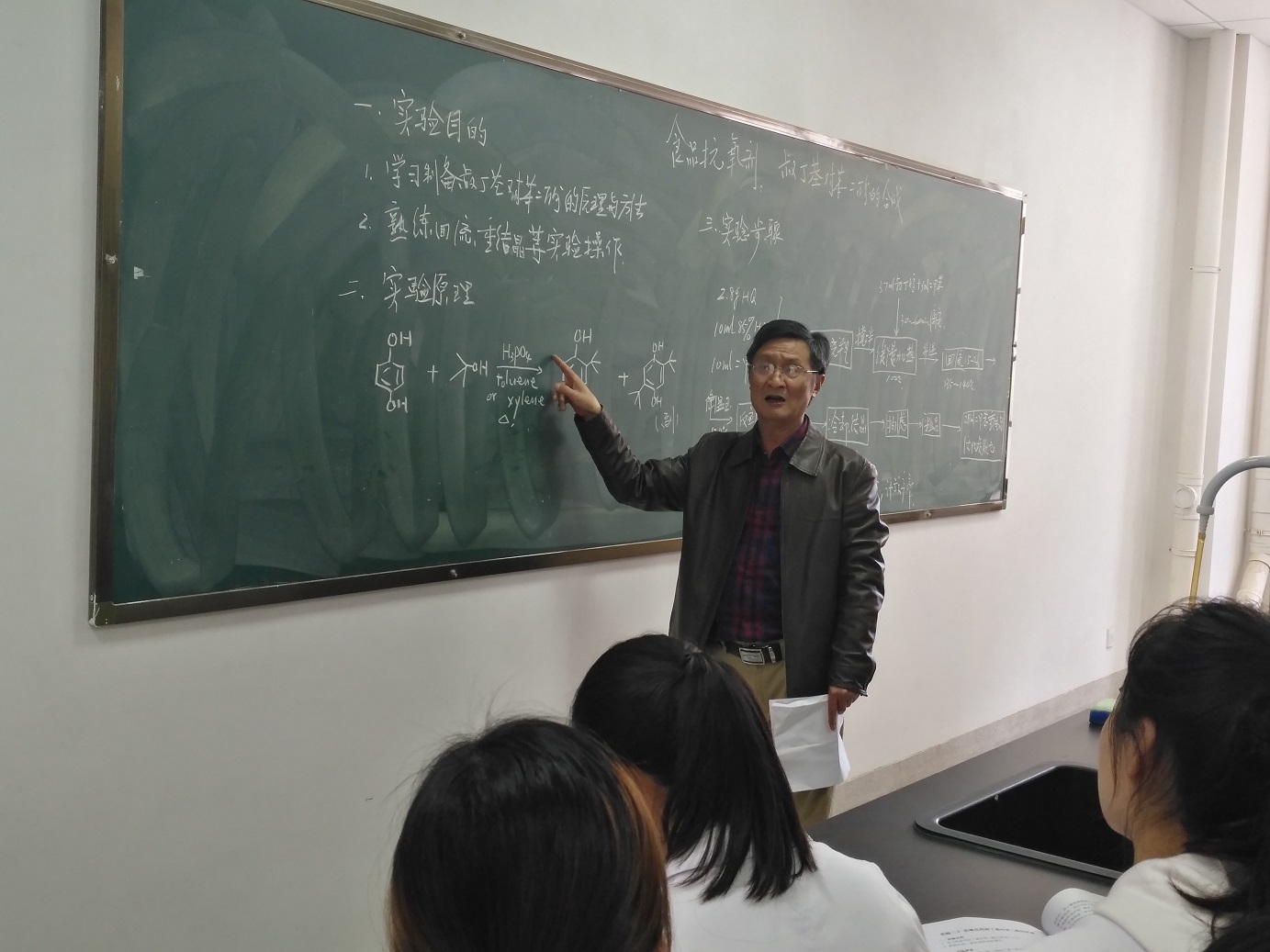 周老师以“抗氧化叔丁基对苯二酚的制备”为实验课题和同学们进行了详细的讲解。在明确实验目的、清晰实验原理和熟悉基本操作的基础上,对芳环上的亲电取代反应进行了重点详细的讲解。从取代基的电子效应到位阻效应,解释了主产物和副产物的竞争关系。对每个试剂的选择和添加和同学们做了详细的解释,使同学们深刻了解实验操作每一步的意义。结合实际情况,他和同学们从实验室的小规模制取到工厂的大规模生产展开了充分的探讨。从了解实际大规模生产和实验室小规模操作的不同,同学们深刻体会了实验室工作的“放大效应”和化学科学技术对推动实际生产实践的重要作用。