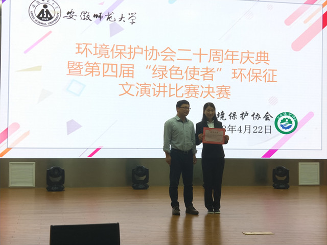 在庆典活动结束后,激动人心的“绿色使者”决赛正式开始。在经过了两个多星期初赛、复赛共1400名选手的激烈角逐,最终共十一组优秀的选手脱颖而出进入决赛。他们怀揣着对环保的热爱,进行了激情澎湃的演讲。比赛过程中,参赛选手们高昂热切的比赛情绪感染了台下的老师同学们,获得了阵阵掌声。他们认真撰写的演讲稿,辅佐以精心准备的PPT、视频,以及在舞台上收放自如的表现,使得这场比赛变得精彩绝伦。主题同样是绿色环保,不同的选手有着不同的思考角度。亦或是着眼于全球生态问题,比如旅游地区,生态保护区被污染的糟糕现状;有的则看到了政府,国家正积极制定方针,为改变现状而不断做出的努力;或是回忆起了童年的风景,回到外婆家坐在田埂上遥望美丽的平野,去到山林中感受青翠的竹林与清新的空气;还有从身边实际出发,以“环保与现实的冲突”为切入点,别具一格。在前五组选手演讲完毕进入统分阶段和最后排名阶段,现场进行了微信墙抽奖活动,被抽中的同学们向环协表达了自己的祝福并领取了精美礼品。最后赵宁,王天翼组以90.28的高分获得了本次比赛的一等奖;李书惠组,王磊组获得了二等奖;王晶晶组,马文婷组,洪亚健组获得了三等奖;其它组获得优秀奖。赛后,获奖选手、环协成员与参会领导老师合影留念。
