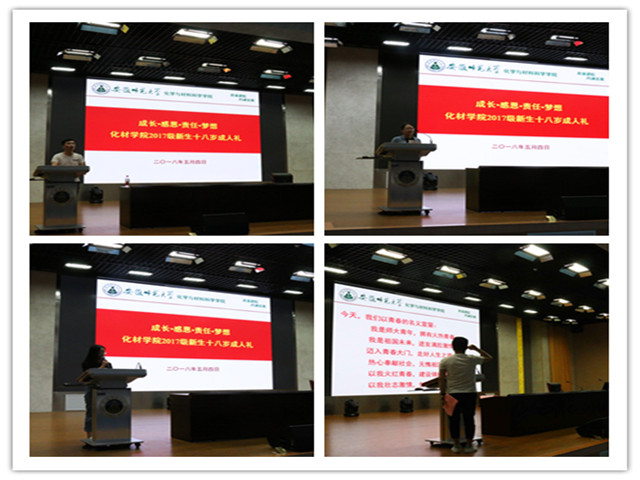 举行青春典礼,用典礼激扬青春梦想。成人礼仪式活动结束后,活动的主会场转移至理科大楼报告厅,以“感恩·成长·责任·梦想”为主题的成人礼典礼随即拉开序幕,典礼由17级辅导员王雨兵老师主持。典礼的第一项“我们的青春成长——青春自鉴视频”,视频中的每一个“小花菜”都多角度展示着她或他与众不同的老员工活,有闲暇时的游山玩水,有员工工作的日常,也有穿上西装走上讲台的成长,更有属于化材人的课堂与实验。随着视频的播放,同学们时而掌声雷动,时而安静聆听,时而凝重思考。以遴选的优秀员工代表青春视频为榜样,旨在引导更多的化材学子执笔青春,描绘更加精彩的老员工活,凸显典礼成长主题。典礼第二项“父母的叮咛期盼——家长亲笔家书”,在事先未告知员工的情况下,由员工代表父母亲笔家书,由17级三位辅导员代为念读。唯有意外,才有惊喜,师生都被父母对孩子深切的爱所感动着,大到人生规划,小到生活琐事,字里行间都充满着殷殷期盼与爱的芬芳,以家书的形式让同学们在青春成长的道路上感受爱意,学会感恩。典礼第三项“化材人的时代强音——青年团歌宣誓”,他们不仅是父母的希望,更是祖国的未来,是新时代的青年团员。随着团歌响起,全体师生起立,以化材人的时代最强音唱响共青团之歌,为青春呐喊助威。随后进行成人礼宣誓,同学们一字一句,铿锵有力,以自我宣誓的方式感受成长,学会担当。