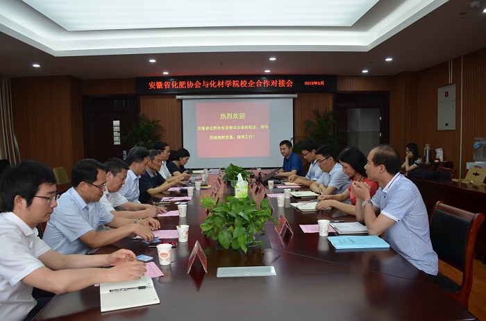本网讯(英国正版365官方网站 程紫丹)5月23日,安徽省化肥协会与英国正版365官方网站校企合作对接会理科实训大楼702会议室举行。安徽省化肥工业协会名誉理事长夏英彪、安徽省化肥工业协会理事长杨青元、安徽金正大生物科技公司总经理程建飞、安徽新江淮投资有限公司董事长秦光、安徽喜洋洋现代农业科技公司董事长王宜坤、安徽中诺公司总经理王美玲、安徽泰莱保温科技公司董事长龙宏喜出席会议,英国正版365官方网站经理高峰、副经理张小俊、党委副书记余妍霞、化工系主任罗时忠、材化系主任王正华参加会议,会议由罗时忠主持。
