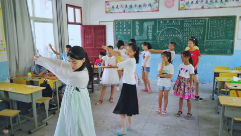 “越罗衫袂迎春风,玉刻麒麟腰带红。楼头曲宴仙人语,帐底吹笙香雾浓。”汉舞课上,志愿者任文敏不惧天气的炎热,穿上繁重的汉服来到了课堂上。“子曰:礼尚往来。举案齐眉至鬓白,吾老年幼皆亲爱,扫径迎客蓬门开。”一段经典汉舞《礼仪之邦》的视频过后,孩子们都被汉舞的优美轻柔给震撼到了。在孩子们渴望了解与学习,近乎于发光的眼神中,老师从汉舞的起源开始,讲解了相关的内容,然后将舞蹈拆分,具体到每个动作,一一教授给孩子们。“老师,你穿汉服的样子好美啊!”一名孩子满脸笑容地对老师说到,用着最简单最朴素的语言表达对老师的尊敬与喜爱,引得志愿者老师满脸笑意。通过志愿者亲身去穿汉服,手把手地教学,而不只是停留在看视频上,大大地提高了孩子们的兴趣,让孩子们在汉舞的优美中学会去拥有一双发现美的眼睛,在日常生活中去发现美、欣赏美。