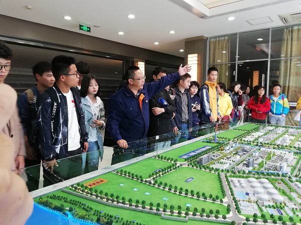 在工作人员的带领下,同学们参观了中央控制室。控制室宽敞整洁,一改同学们对化工厂“脏乱”的印象。在厂区沙盘前,工作人员向同学们展示了整个工厂的工业流程,着重介绍了工厂对废料及污染物的处理,并提出“绿色化工”的环保理念。工作人员还结合动画对化工长的生产流程进行了讲解,使同学们更加深刻理解了化工厂生产所运用的化学原理。