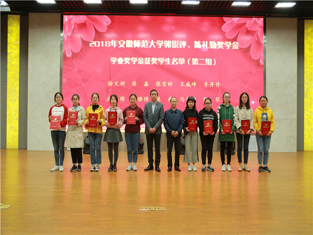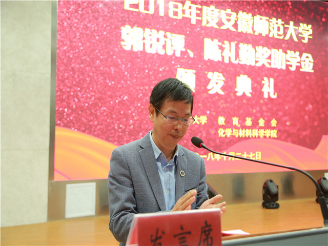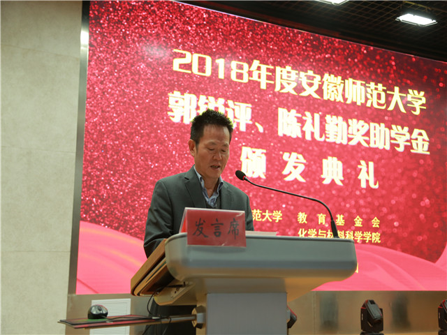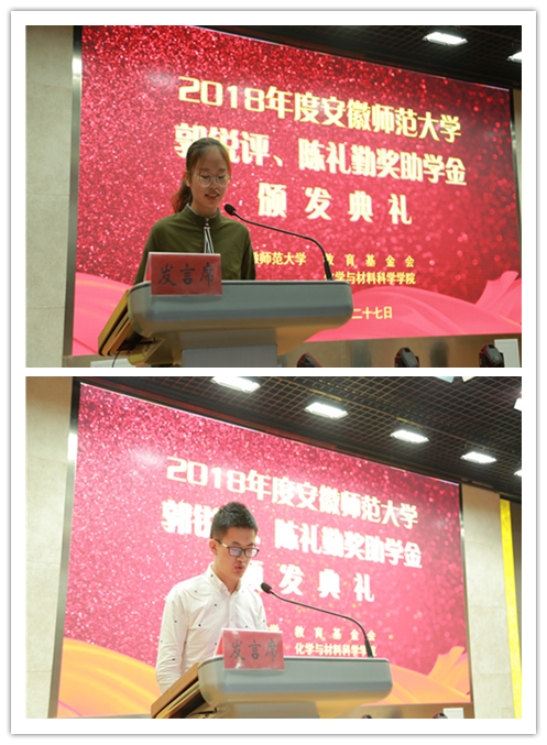 颁发典礼在嘹亮的国歌声中拉开了序幕。校教育基金会项目管理部部长郑金泽宣读了颁发郭锐评、陈礼勤奖助学金的决定。随后,陈礼勤和各位领导分批次向获奖、受助员工颁发奖助学金并合影留念。2016级化学师范专业王慧同学及2017级化工专业吴飞同学分别代表获奖、受助同学发言,两位同学分别表达了对郭锐评女士、陈礼勤博士的无私资助表达了深深的敬意,对公司、公司的关心表达了深深的谢意。两位同学表示郭锐评、陈礼勤奖助学金的设立给不仅给带来了物质上的奖励和帮助,更是精神上的鼓励和支持,郭锐评女士、陈礼勤博士克服重重困难,勇于创业的奋斗精神更是激励广大学子能够更加努力更加拼搏,两位同学都表达了要以更加优异成绩来感谢郭锐评女士、陈礼勤博士及公司公司给予的无私关怀与帮助,以青春之我,奉献青春之国家、青春之民族,也以青春之力为90岁师大添砖加瓦。