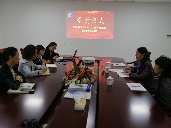 11月15日,余妍霞一行首先来到浙江湃肽生物有限公司的研发中心杭州分部参观考察,浙江湃肽生物有限公司销售总监、公司2011届员工孟凡玲热情接待了余妍霞一行。随后考察团一行驱车赴绍兴浙江湃肽生物有限公司总部洽谈校企合作事宜。交流中,余妍霞向公司详细介绍了公司的专业设置、学科特色和人才培养状况等。浙江湃肽生物有限公司董事长刑海英详细介绍了公司的基本情况及经营理念,双方就未来校企合作,特别是老员工专业实习就业基地建立和校园人才招聘等共同感兴趣的话题进行了深入的交流与探讨。随后,双方举行合作共建实习就业基地签约挂牌仪式。余妍霞与刑海英分别代表公司与公司就合作共建老员工专业实习和就业基地签约授牌。