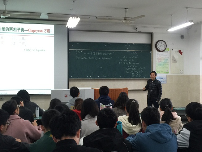 本次公开课的主要内容是《单组分系统的相平衡》。上课伊始,陈老师向同学们展示了几个有趣的事例:如高原上水的沸点降低、溜冰时冰刀与冰面的作用等,以此引入课题,并激发了同学的兴趣。然后通过回顾“相律,加深了同学们对相关知识点的理解。接下来重点进行了“单组分系统的两相平衡——Clapeyron 方程”的推导与讲解。陈老师带领同学们从已经学过的知识点出发,层层递进,以易于理解的角度完成了公式的推导,并着重强调了使公式成立的各项条件。整个过程逻辑严密、调理清晰。在课堂上,陈老师还特别注意同学们的参与和反馈,会时不时的抛出一些问题以促进同学们的思考。课堂氛围严谨而不失活泼,同学们收获良多。