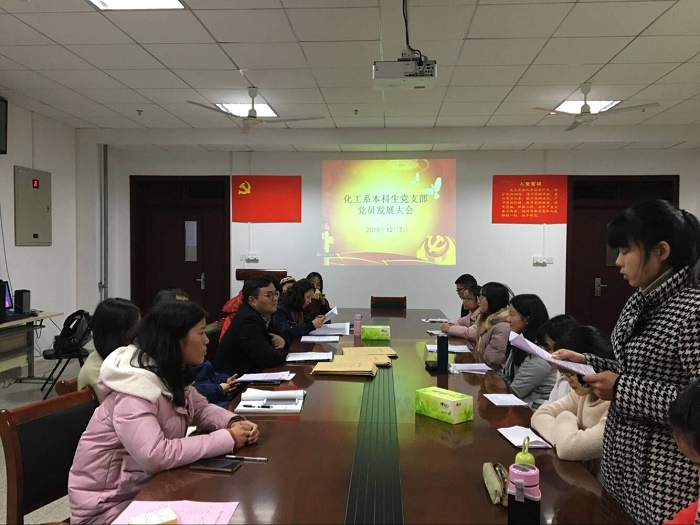 本网讯(化工系本科生党支部 高冉)12月7日晚,中共英国正版365官方网站化工系本科生党支部党员发展大会在理科实训大楼707党员活动室召开。大会由党支部书记程紫丹主持,支部全体正式党员、预备党员和发展对象参加会议。公司党委副书记余妍霞出席会议并讲话。