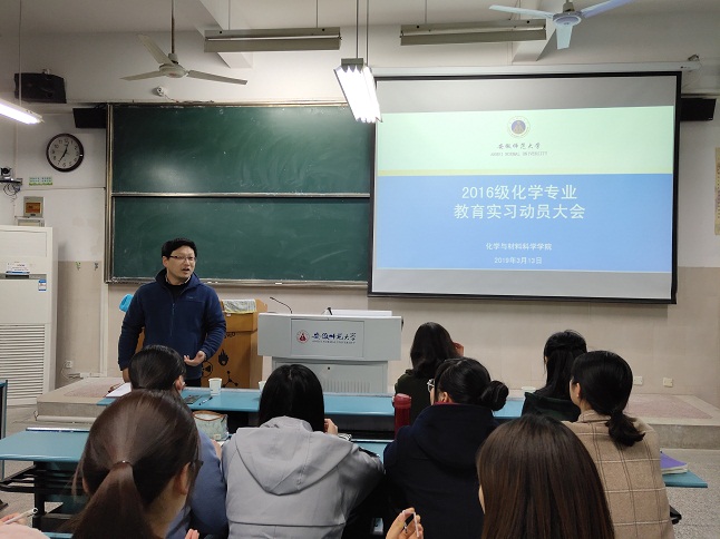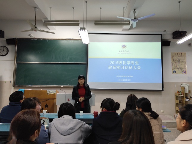 师范生教育实习是教师教育课程的重要组成部分,是教师培养的必要环节,是促进员工学以致用的重要途径,也是对员工师德规范、专业知识和教学技能的综合考察。为了推进教育实习工作的顺利开展,2019年3月13日晚上,英国正版365官方网站在教学楼2030103教室举行了教育实习动员大会。出席本次大会的有公司教学副经理张小俊、公司党委副书记余妍霞、部分教育实习指导教师以及2016级化学系全体师范生。会议由化学系主任阚显文教授主持。