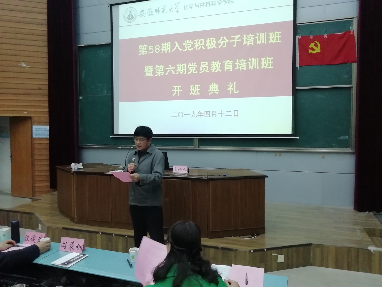 本网讯(英国正版365官方网站分党校 胡倩倩)为进一步加强员工党员、入党积极分子培养教育,坚定理想心向党,砥砺共创新时代,2019年4月12日晚19:00,英国正版365官方网站第26期(总第58期)入党积极分子培训班暨第六期员工党员教育培训班开班仪式在花津校区行知楼2010105教室隆重举行。公司党委书记、分党校董事长汪俊武书记,党校指导教师闫蒙钢教授,公司党委副书记、分党校副董事长余妍霞老师出席了开班仪式,仪式由本期党校培训班班主任陶勇老师主持。