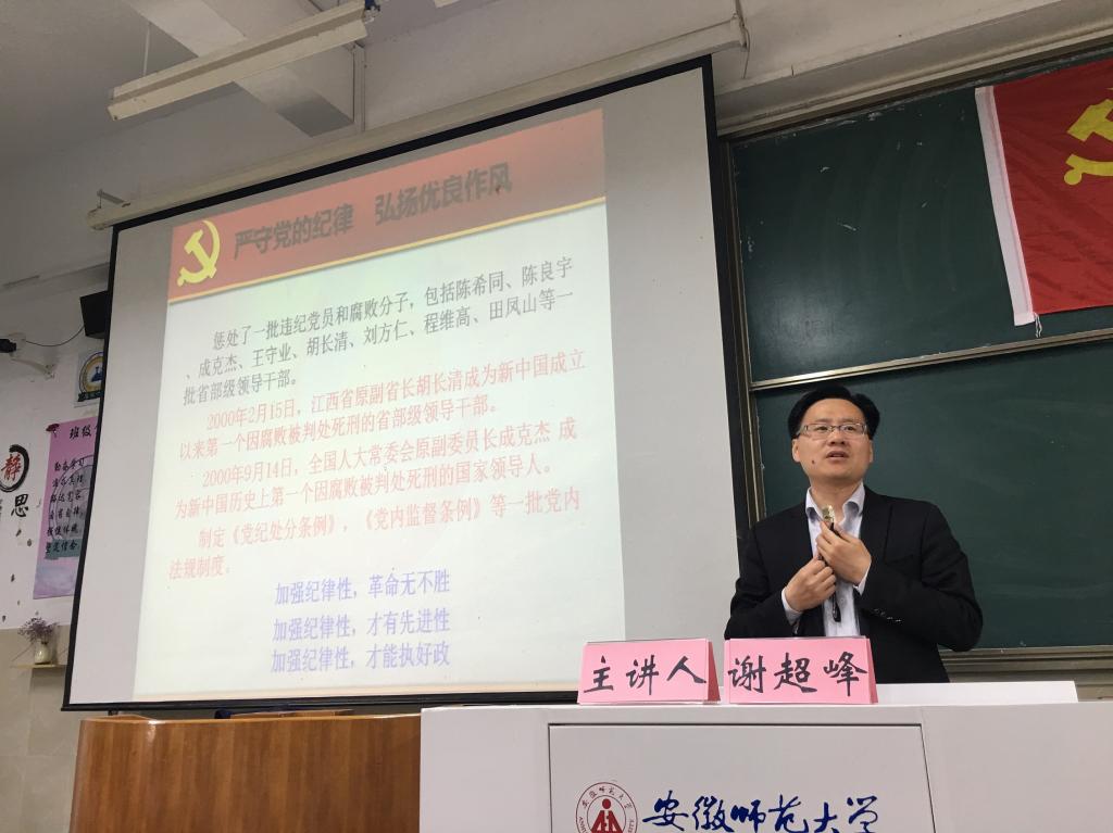 其次谢部长为全体学员讲述了如何锤炼党性修养、永葆先进本色。谢部长指出全面从严治党的实践与推进与牢固树立党的一切工作到支部的鲜明导向是非常重要的,并且在课程的最后针对广大预备党员如何锤炼党性修养、永葆先进本色提出了几点希望,他希望党课班学员要做到:一、提升综合素质,做到“五带头”:(一)带头坚定信念(二)带头勤奋学习(三)带头全面发展(四)带头服务奉献(五)带头弘扬正气;二、遵守与传承党风党纪,发挥先锋模范作用;三、坚持“四讲四有”,努力做到四个合格。四讲:讲政治、讲规矩、讲道德、讲奉献;四有:有信念、有纪律、有品行、有作为;四个合格:政治合格、行纪律合格 、品德合格、发挥作用合格;四、以反面典型为镜鉴,讲政治、重规矩、作表率。